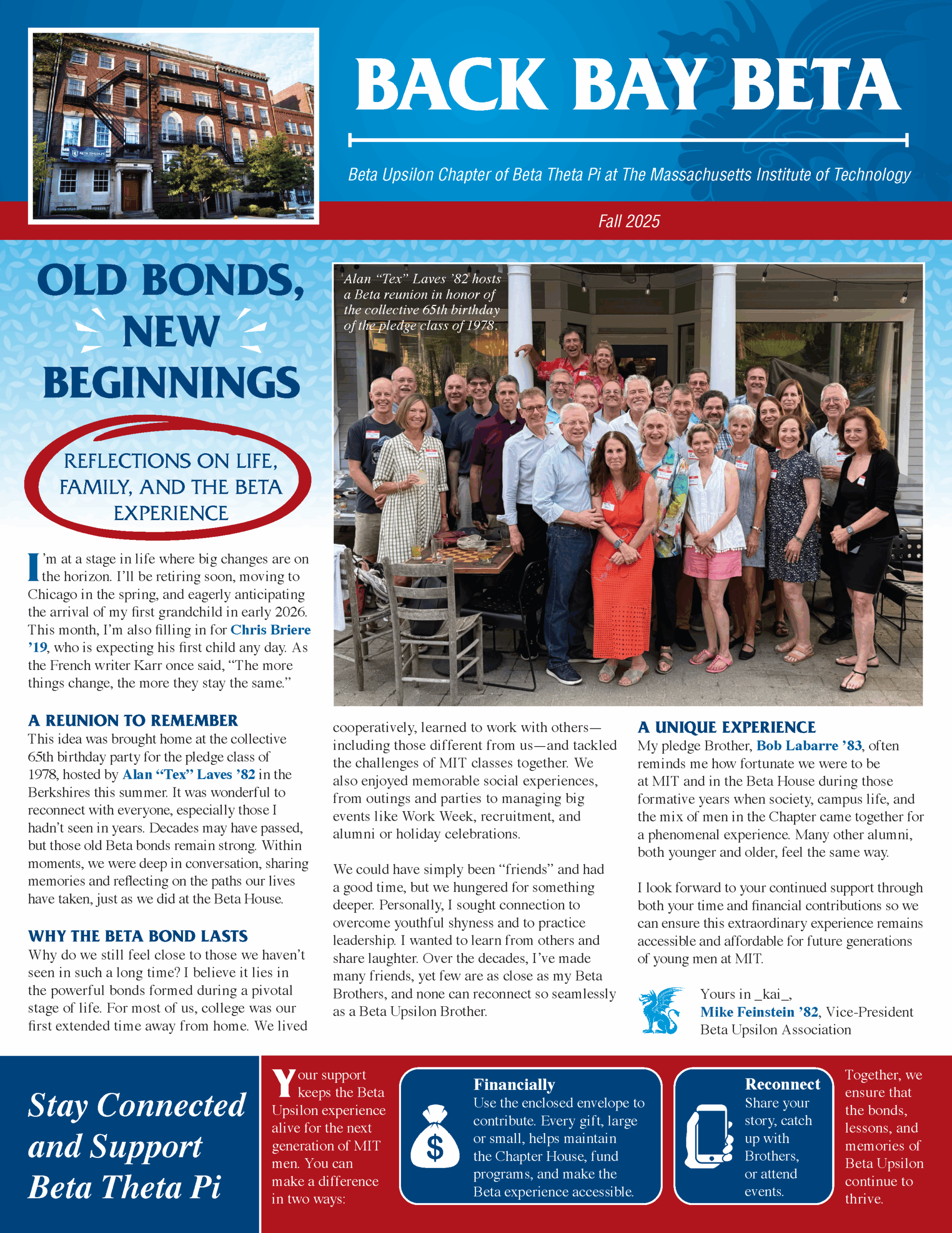 For many years, Beta Upsilon has made alumni communication a priority. From our early publications of The Back Bay Beta to today, we strive to keep our alumni invested and interested in the happenings of our chapter.